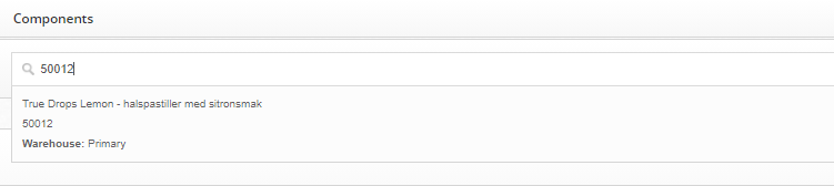 Inne på produktsiden finner du “components”, og det er her du begynner å legge til hvilke komponenter (produkter) som skal inngå i kitet. Dette gjør du ved å søke opp SKU/produktnavn i søkefeltet, og trykker på riktig produkt. Gjør dette for alle produktene som skal inngå i kitet.