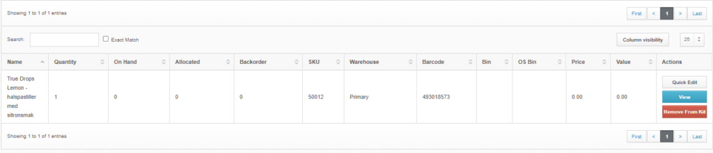 Videre trykker du på “quick edit” til høyre for varelinjen du har lagt til i kitet, og justerer antallet for det respektive produktet. Kunden bør ha oppgitt kvantitet for ethvert produkt som skal inngå i kitet. Klikk på “update” når riktig antall er lagt til.