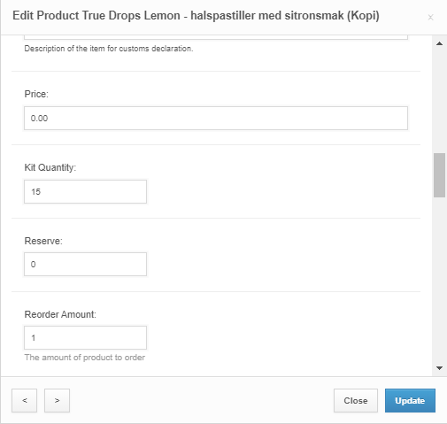 Slik ser det ut når du klikker på “quick edit” for en komponent i kit. Det er under “kit quantity” du legger inn antall av produktet som skal inngå i kitet.