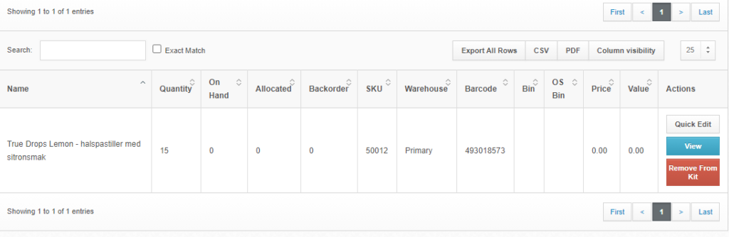 Et “kit” i Shiphero fremkommer som et hvilket som helst annet produkt, med det unntaket at dette produktet består av flere produkter. Dette ser du under “components” inne på produktsiden til produktet.