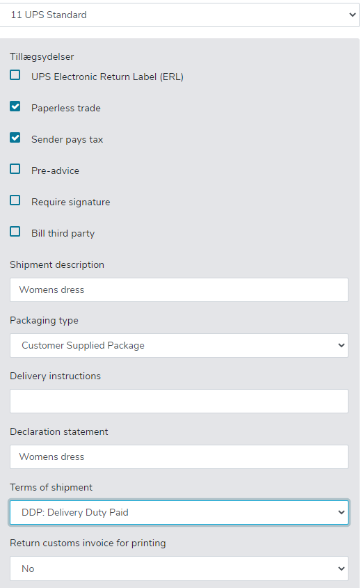 «Terms of Shipment» skal enten være DDP (Deliver duty paid – Avsender betaler avgifter) eller DAP (Mottaker betaler avgifter)