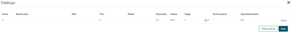 Her skal du fylle ut antall og beskrivelse på hvert enkelt produkt som skal sendes, samt pris UTEN moms, momssats (alltid 25%) og valuta (Alltid NOK) fyll også ut tariffnummer og opprinnelsesland. Uten denne infoen får du ikke opprettet forsendelsen. Klikk «gem/save» når du har fylt ut nødvendig info.
